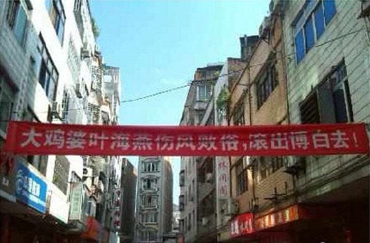 【图说天朝】“大鸡婆”滚出博白 2013年6月13日 @北京青年报:【叶海燕获释遭围攻被骂“大鸡婆”】“校长开房找我”始作俑者叶海燕12日早上拘留期满。未料人还没有出来,家里就收到了房东的“驱逐令”。12日刚一到家,家门口就聚集了大批不明身份的人高声叫骂,大街上竟然拉起横幅进行"围殴"。让人担心这位民间女权维护者将来路在何方? 所在分类:影视收藏标签:何方,叶海燕,“开房找我”,校长 相关文章 叶上雨的原创空间|叶海燕:我想离婚 【重温】【404文库】叶上雨的原创空间|叶海燕给全社会的一封求助信 【404文库】爱国不够有力量,立场不够坚定,都可能成为被他们打击的对象(外二篇) 【404文库】叶上雨的原创空间|叶海燕给全社会的一封求助信 真实故事计划Pro|「小姐代言人」的退却
