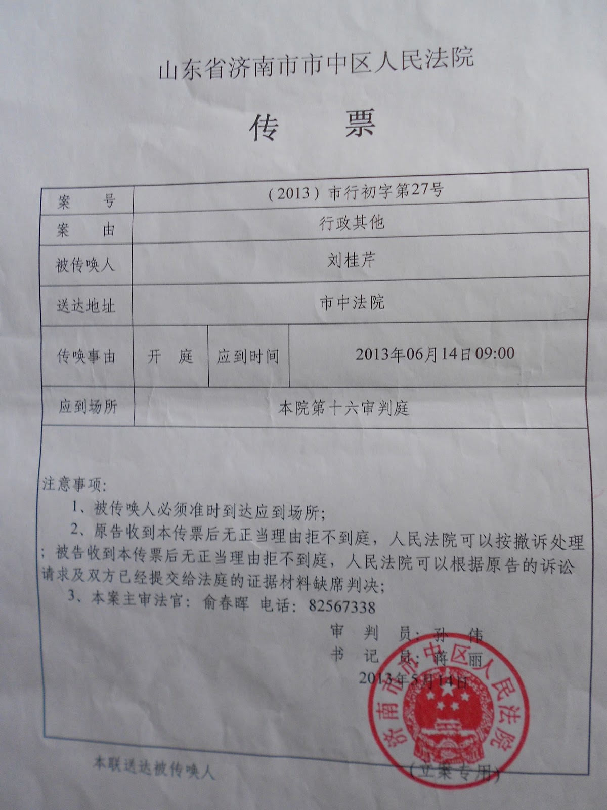 (维权网信息员张宁宁报道)2013年6月14日上午9点,刘桂芹诉济南市社会保险事业局未履行法定职责一案在济南市市中区人民法院开庭,旁听者众多,但被告济南社保局未能到庭。合议庭当庭宣布:经合法传唤,被告济南市社会保险事业局无正当理由,拒不到庭,现在休庭;下次开庭,定于6月18日下午2点,并向刘桂芹当面送达了传票。旁听者议论纷纷,指责被告济南社保局藐视法庭。