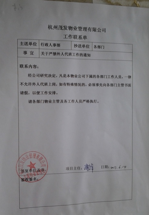 由于“六四”那天凌晨吕耿松突然消失,九莲社区现在晚上有了巡逻队。吕耿松的妻子汪雪娥因工龄问题和浙江警察学院院长傅国良侵犯他们参加房改的权利,曾两次去北京上访(一次在杭州被截拦,一次在北京被截拦)。为了防止汪雪娥再去北京上访,九莲社区所属的杭州茂发物业管理有限公司于6月14日在汪雪娥上班的值班室贴上一张《关于严禁外人代班的通知》,矛头显然是针对汪雪娥的,因汪雪娥去北京及上访时,吕耿松给她代过班。如果按通知要求事先打报告,上访肯定去不成。如果想不受这个通知的约束,那就得辞职,但吕耿松一家现在主要还靠汪雪娥的工作维持生计。就这样,惯于落井下石的共产党就利用它扼人喉管的权力迫使汪雪娥就范,当然这也是它迫害异己的惯用手段。