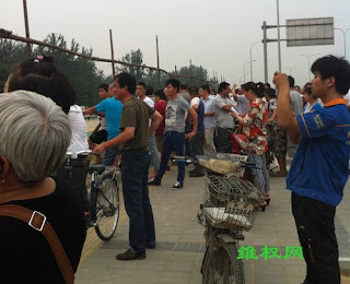 (维权网信息员唐韵报道)黑龙江访民张继臣因控告巴彦县公安局警察姜会臣、刘庆权徇私枉法,检察院、法院枉法判案,长期上访案件得不到解决,于6月19日一大早,爬上了北京公益西桥南面路灯杆顶端,并挂出“张继臣控告黑龙江省巴彦县公安局警察姜会臣刘庆权徇私枉法检察院法院枉法判决”的条幅,还不时地向下撒传单以此抗议司法腐败。直到6月20日下午6点,人还没下来。