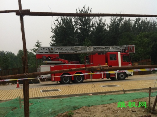 今天北京的气温是摄氏34度,前来解救的消防人员在现场安放救生垫,带有消防云梯车停止旁边。路旁站了很多围观的群众……