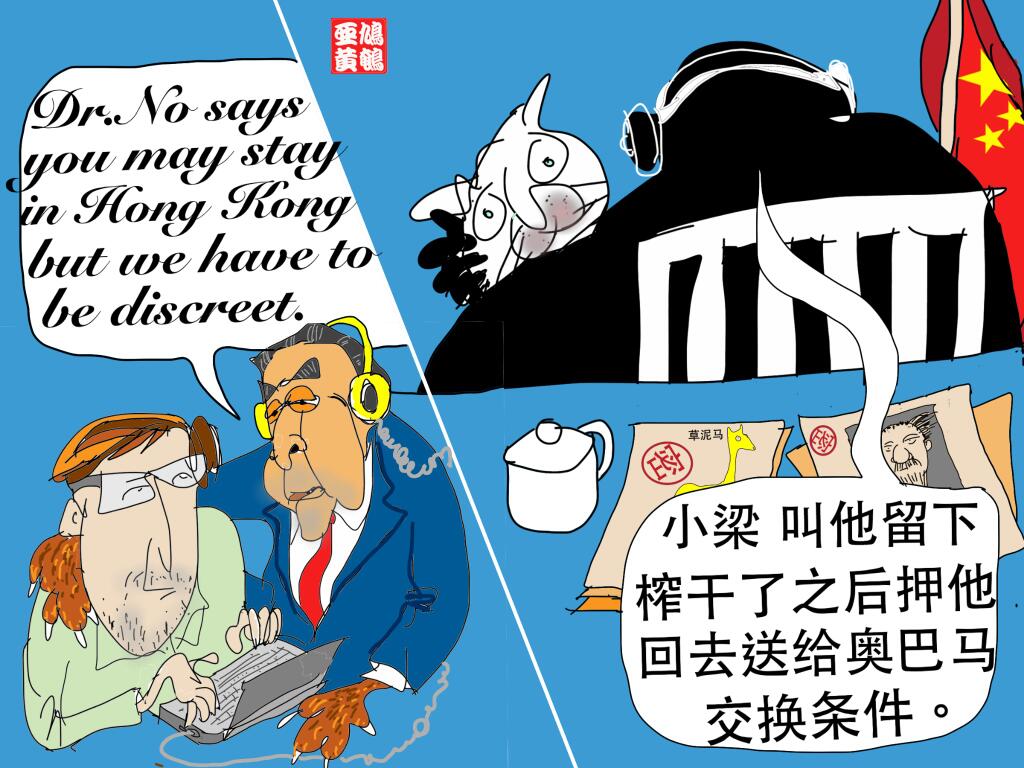 6月23日,美国家安全局前雇员斯诺登离开香港,并于当晚抵达莫斯科。香港特区政府证实了这一消息,并表示特区政府在未获得足够资料处理临时拘捕令的情况下,并无法律依据限制斯诺登离境。据俄罗斯媒体报道,斯诺登购买了24日中午从莫斯科飞往古巴哈瓦那的机票,其最终目的地或为委内瑞拉首都加拉加斯。美国通知俄罗斯,已撤销斯诺登的护照,希望俄罗斯驱逐他。24日凌晨,厄瓜多尔外长在“推特”发文称,厄已收到斯诺登的庇护请求。斯诺登一事在中国网民眼中有不少观点对立的评价,例如一些网友与官方媒体持类似态度,认为斯诺登揭露了“美帝阴谋”,以英雄身份视之。一些网友则认为斯诺登一事只对美国民众有意义可言,而中国人仍然处身在与棱镜有本质差异的防火墙禁锢之中,不可相比拟。一些网友肯定斯诺登事件对互联网自由这一理念的强调,虽然并不认同他的一些个人行为。还有一些网友则批评斯诺登是一个“天真的左派”,因为从他躲避的国家来看,都是一些比美国人权现状糟糕很多的地方。漫画家鳩鵪推出了几张斯诺登事件的漫画,从“吐槽中共”角度描绘了他眼里的斯诺登事件。