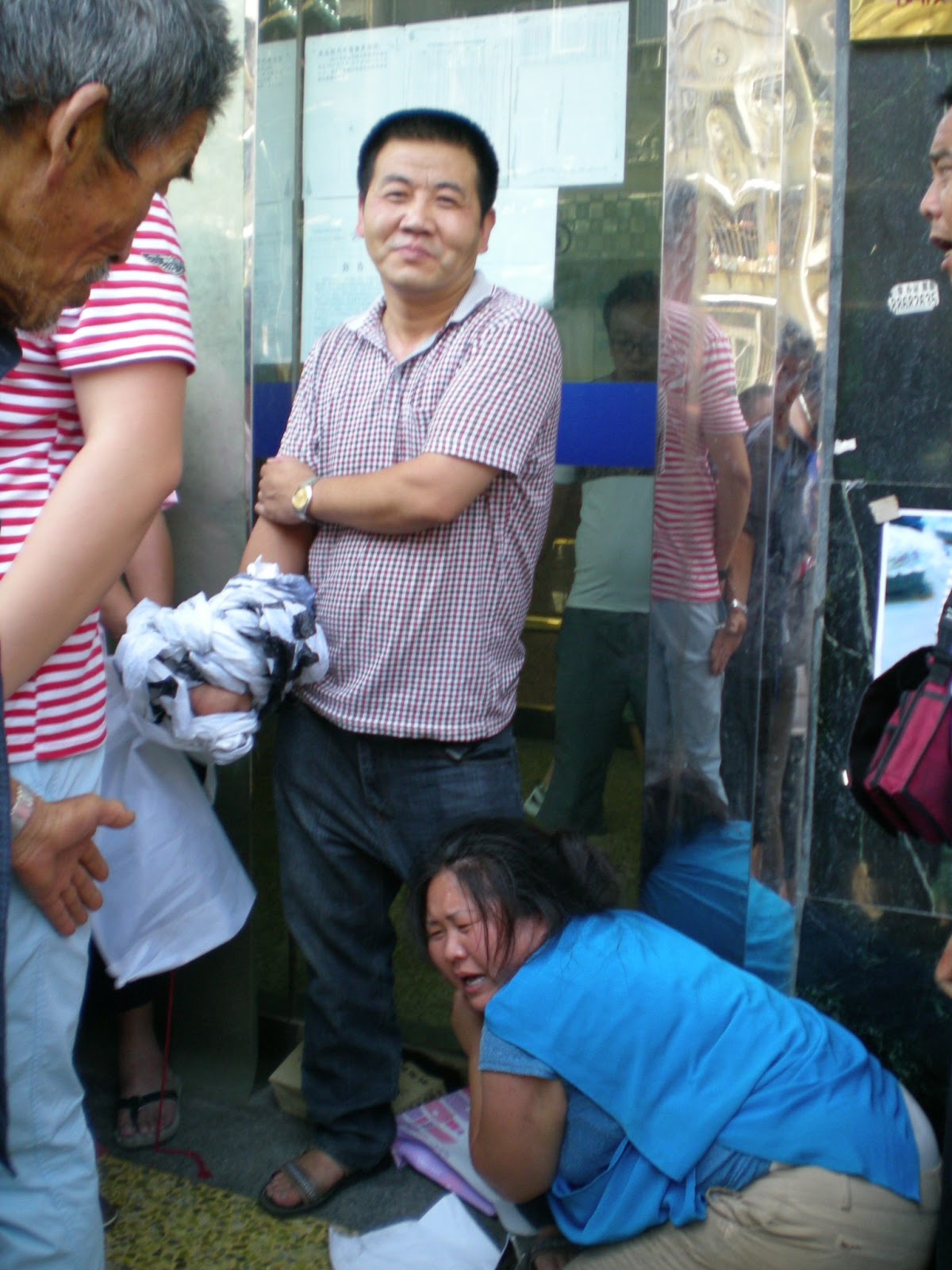 (维权网信息员于富民报道)2013年6月28日上午,西安数百出租车经营户冒着摄氏38度的高温, 再次到西安市信访接待中心上访, 遭推诿后到西安市出租汽车管理处抗议。 王苏娜等营运户在管理处大门外张贴家中被砸被骚扰的照片, 悬挂标语。标语上写着:“省中北出租汽车公司带领黑社会抢车、 砸家、打人,朗朗乾坤,王法何在?”很快, 就有十几个省中北公司的人到了管理处, 为首的就是16日晚非法闯入王苏娜家打砸骚扰的刘队长。 这伙人撕扯照片,抢夺标语,把王苏娜从大门口打到十几级台阶下。 王苏娜抱住刘队长大腿不放,众运营户围住行凶者质问谴责。