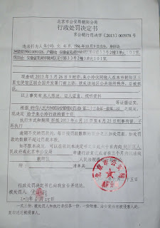 (维权网信息员张宁宁报道)6月25日,北京市公安局朝阳分局向芜湖朱小玲送达《行政处罚决定书》(京公朝行罚决字【2003】003978号),称“现查明2013年5月26日9点许,朱小玲伙同他人在本市朝阳区三里屯使馆区联合国开发署门前上访,扰乱该地区公共秩序,后被抓获……现决定给予朱小玲行政拘留十日。执行方式和期限:折抵2013年6月15日至6月25日刑事拘留,不再执行。送达日期为:2013年6月25日。