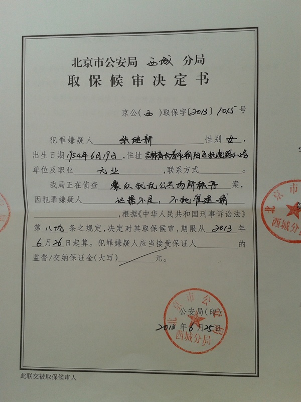据被羁押37天后获得取保候审的张继新陈述,5月17日晚刚刚来到北京。5月18日厄运就突然来临。当时她与走在天坛北门的马路上的邓志波一起被北京警方无故抓走,被以“聚众扰乱公共秩序”罪刑事拘留,羁押在北京市西城区看守所,整个过程没有法律手续。在被刑拘37天后于6月25日取保候审“释放”。