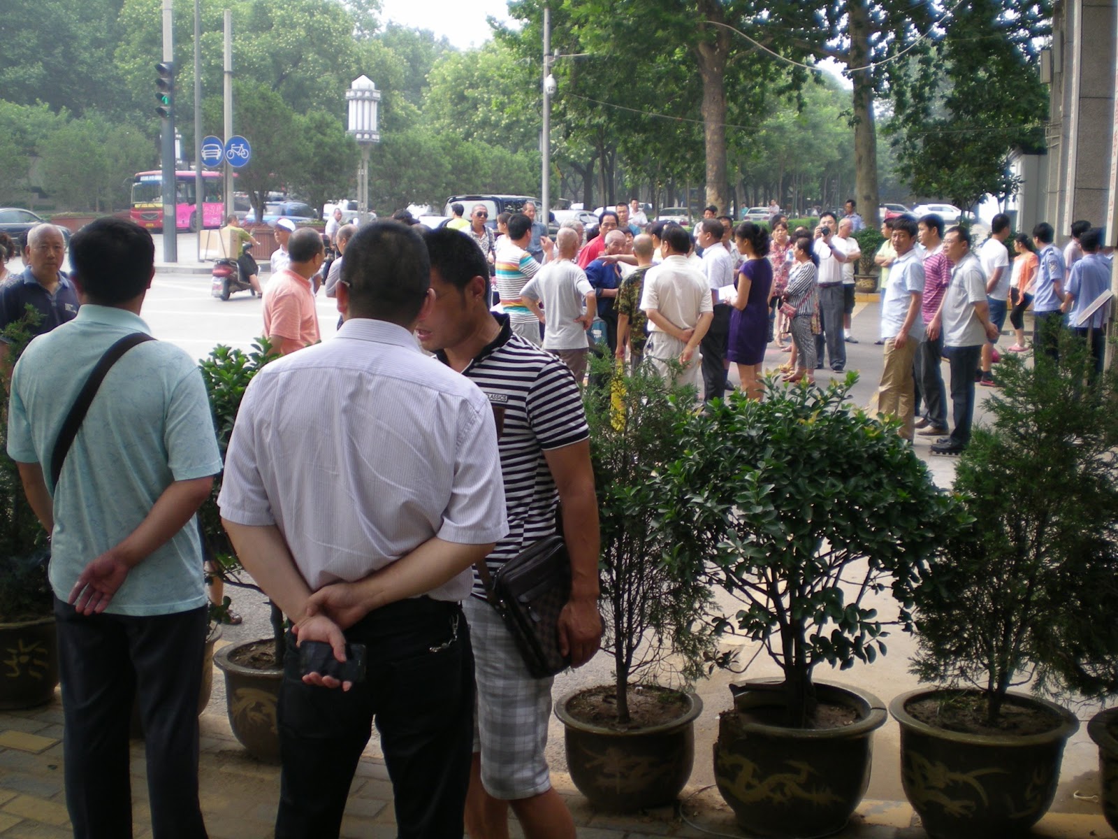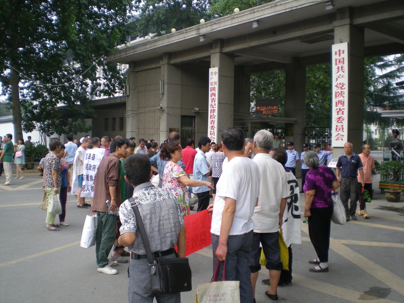 (维权网信息员于富民报道)今天2013年7月3日上午,西安市未央区草滩镇郑家寺的上百个村民冒着酷暑, 到中共陕西省委请愿,在省委大门口聚集,要求见省委领导, 反映村主任杨满利抢占土地的问题。这个问题他们反复向草滩镇、 未央区、西安市政府反映过,强占土地的问题不能得到制止, 他们来看看省委领导能不能解决。