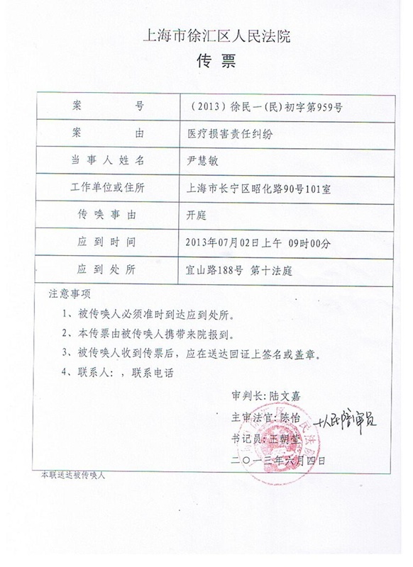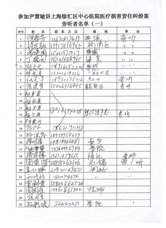 (维权网信息员雷鸣报道)7月2日 上午9时 ,上海30多名维权人士参加旁听尹慧敏诉上海市徐汇区中心医院医疗损害责任纠纷一案,上海市宜山路188号徐汇区法院第十法庭公开审理了此案。