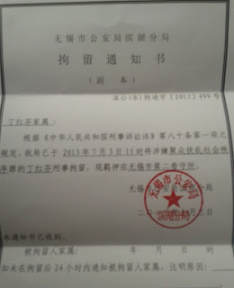 (维权网信息员高怡闵、徐闯报道)7月5日,无锡市公安局滨湖分局向丁红芬家属送达滨公(东)拘通字【2013】499号《拘留通知书》,称:“我局于7月3日将涉嫌聚众扰乱社会秩序的丁红芬刑事拘留,现羁押在无锡市第二看守所。”与丁红芬一样被刑拘维权人士,还有同时参加营救黑监狱受害人的沈爱斌和瞿峰盛。