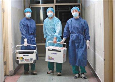 - 2012年8月16日凌晨,河南栾川县人民医院,医务人员提着装有捐献者胡小现器官的冷藏箱走出手术室。