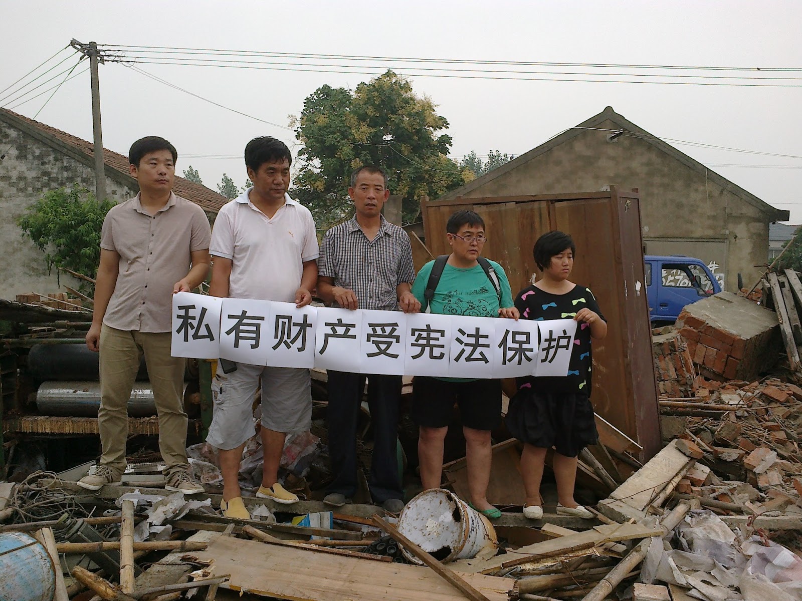 陈光福查看了张俊国刚刚遭受非法强拆的现场,看到一片狼藉的现场和废墟下掩埋的机器设备非常气愤,和张俊国夫妇等人一起在废墟上打出“私有财产受宪法保护”的横幅表达对肆意践踏宪法,随意损害公民私有财产的违法行为的抗议。 看到现场有人在明目张胆地抢劫被砸碎的机器及零部件等财产,他们当即拨打110报警。