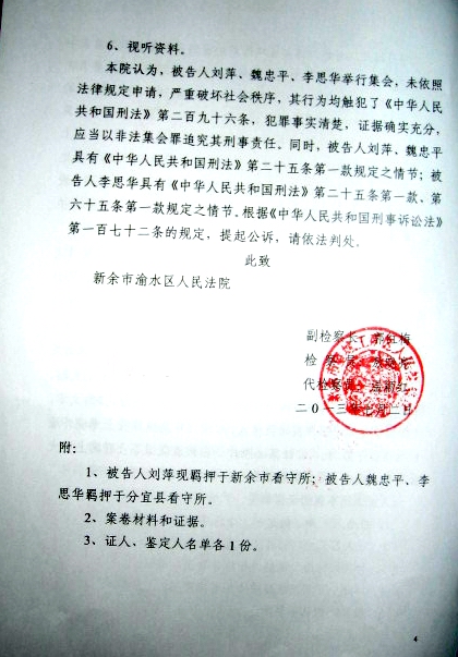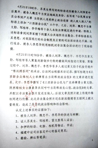 起诉书中又指,2013年4月20日,黄文勋到达新余,刘萍等人在家中商讨举牌事宜,拟定:要求官员公示财产无罪,释放丁家喜及良心犯,停止政治迫害,结束专制独裁等标语。21日,刘萍等十余人未经申请即到刘萍家楼下手举标语举行非法集会。并接受《博讯》网站采访及将文章和照片发到《维权网》上,集会照片被在互联网上大量转发。