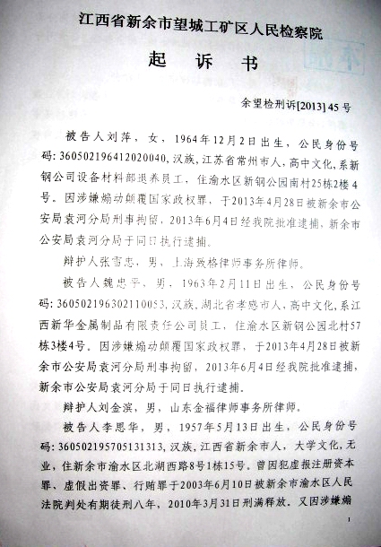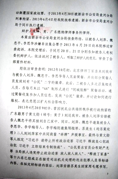 据了解,新余警方在对刘萍、魏忠平、李思华的刑事传唤和立案时,指控的罪名是“聚众扰乱公共秩序”,随后在对三人刑事拘留时,变更为“涉嫌煽动颠覆国家政权罪”,批准逮捕时又变更为“非法集会罪”。
