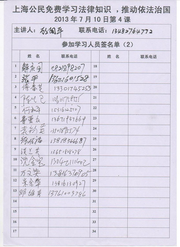 (维权网信息员雷鸣报道)7月10日中午11时45分~12时45分,上海公民免费学习法律知识,推动依法治国第4课成功完成。