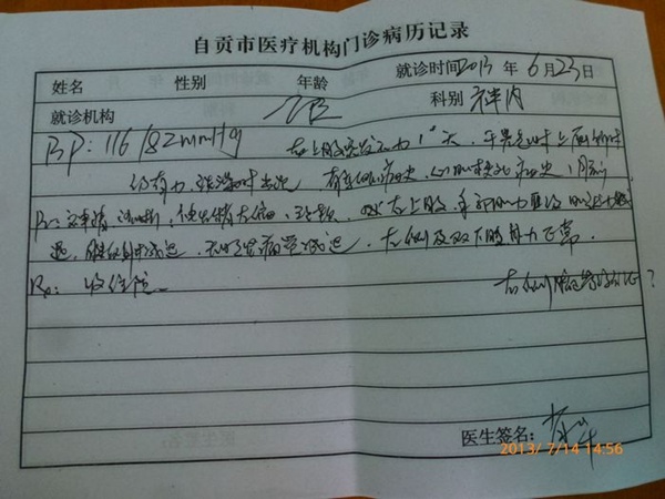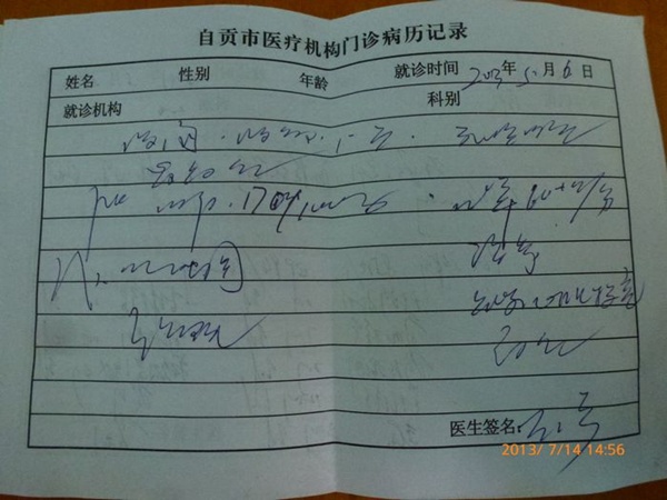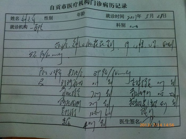 据当地维权人士罗世模(13183924409)先生介绍:6月23日刘正有右手和左脑麻痹并基本瘫痪,再次住进自贡市第一医院,病情证明书上显示:经诊断为多发性脑梗塞,颅内动脉粥样硬化,右上肢周围神经损伤,冠状动脉粥样硬化性心脏病,急性前壁心肌梗死后恢复期,高血压3级高危2型糖尿病。7月5日,病情稍微减轻,就不得不办理出院,因刘正有无钱继续治疗。