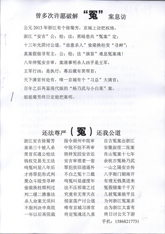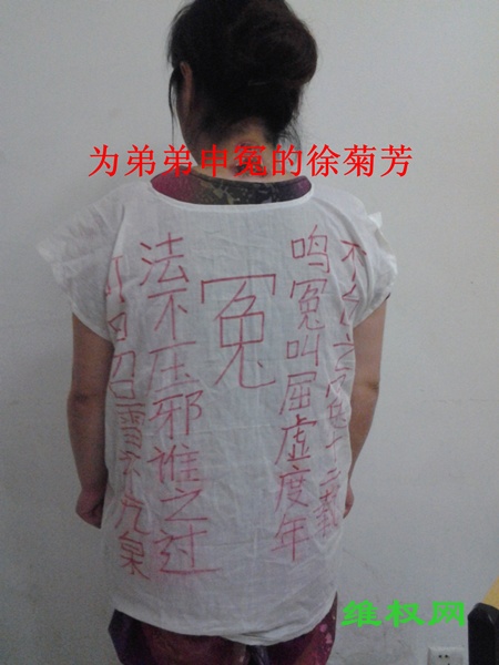 徐菊芳的弟弟徐旭康于2000年被安吉县人大代表金红星、金朝鑫兄弟雇佣的黄军等黑社会分子无故杀死。当时,金家兄弟因经济济纠纷和马立东等人斗殴,金红星叫来黄军等做打手,斗殴的一方叫徐旭康前来作证,但徐旭康一下车就被黄军、朱清、沈金发、陈张成、王志平五人乱刀捅死。因金家有财有势,此案到2008年才被安吉县公安局立案侦查,同年7月2日安吉县法院以“寻衅滋事罪”判处五名凶犯有期徒刑二年(缓刑二年)至拘役不等。弟弟惨死,凶手逍遥法处,徐菊芳为弟弟一直申诉、上访。2011年8月22日,浙省高级法院指令湖州市中级法院再审,但湖州市中院却在2012年10月15日发回安吉县法院重审。安吉县法院于今年4月19日开庭,但到现在还没有作出判决,杀人凶手也没有羁押。按照刑事诉讼法规定,有可能判处无期徒刑以上的案件,县级法院是没有资格审理的。所以,安吉县重审此案,意味着凶手不会受到严惩。更奇的是,开庭前安吉县公安局以“贩毒”的罪名抓走了徐菊芳的儿子,政法委和公检法的人反复找徐菊芳说,只要她不再抓住她弟弟的案子不放,他儿子可以不受刑事追究。徐菊芳儿子的所谓贩毒案,“毒贩”只有她儿子一人,她怀疑是当局栽赃或“钓鱼”,目的是让她不要再究她弟弟的案子。
