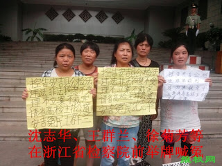 (维权网信息员黄天怒报道)7月15日下午3点,浙江省安吉县访民徐菊芳、沈志华、王群兰等到省检察院上访。起初,一位自称申诉控告接待室主任的检察官非常凶狠地责骂她们:“你们来干什么?!”并试图把她们赶走。沈志华等人于是就在大门外穿冤衣、举冤牌,大呼冤枉,并高喊“打倒腐败”等口号,引来上百人围观。许多过往行人纷纷指责检察官。在众怒难犯下,这个自称主任的人只好接待沈志华等五人,并告知一个星期后答复。