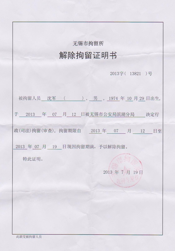 (维权网信息员张宁宁报道)7月19日,无锡市拘留所向因冲击无锡黑监狱而被关押的沈军送达了2013字(13821)号《解除拘留证明书》。该《证明书》称“被拘留人2013年7月12日至7月19日因拘留期满,予以解除拘留。”