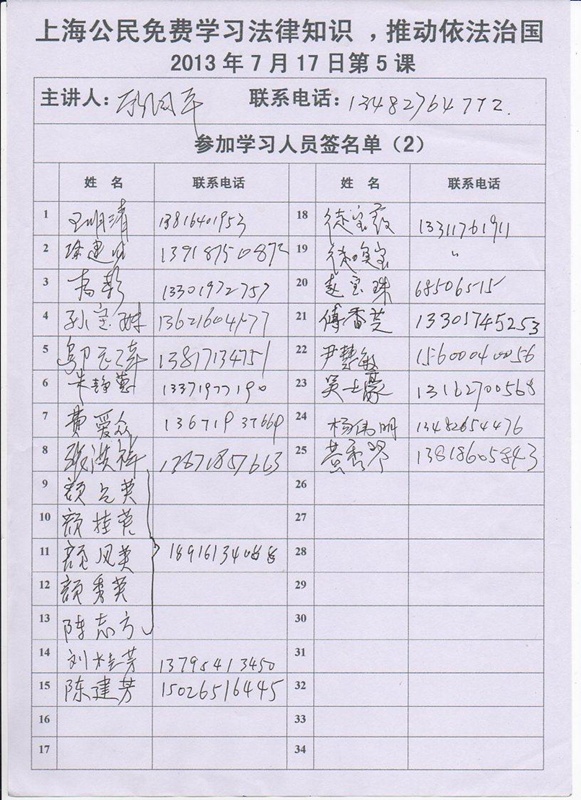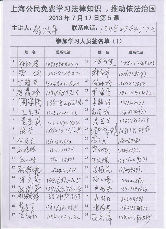 (维权网信息员孙小芸报道)7月17日 中午11时45分 ~12时45分,上海公民免费学习法律知识,推动依法治国第5课课程成功完成,有57位公民参加学习。
