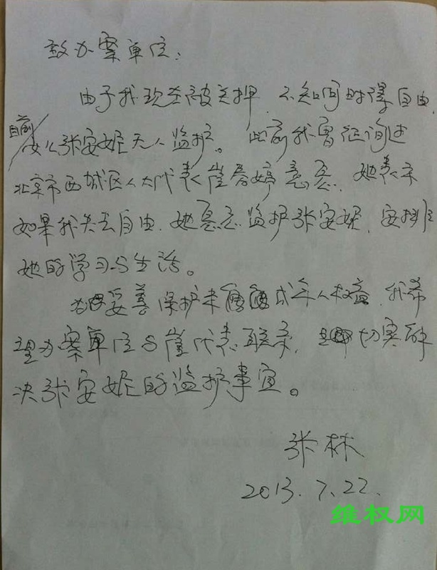另外,为了未成年的女儿张安妮的监护人一事,张林亲笔写下一份嘱托给办案单位,希望女儿由北京市西城区人大代表崔春婷代为抚养张安妮。