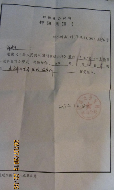 (维权网信息员华新报道)7月26日下午两点钟,合肥维权人士姚诚被蚌埠刑警大队5-6个警察刑事传唤带走。据了解,当天上午11点钟,蚌埠蚌山分局刑警大队的多名警察到合肥姚诚住所敲门,因考虑自身安全他一直未开。大约两点多钟的时候,姚诚以为他们都走了开门出去时,却被蹲守在门口的几个刑警抓走,随后姚诚被刑事传唤带往琥珀山庄派出所审讯。