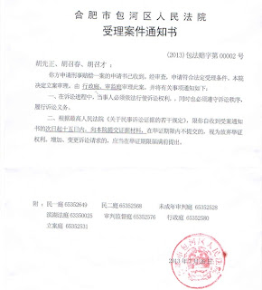 (维权网信息员周维林报道)7月29日上午9时许,合肥市包河区失地农民胡先正,按合肥市包河区法院26日通知到法院领取了(2013)包法赔字第00002号《受理案件通知书》,合肥市包河区法院行政庭的倪庭长和书记员在行政庭办公室对胡先正称,《受理案件通知书》是固定格式,你们的证据已经有了,并表示下个星期会给予赔偿决定书。