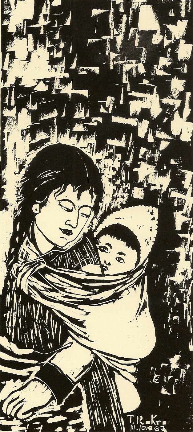 我想是在同一年,仁波切制作了一幅出色的木刻版画,内容是一位母亲带着孩子逃离遭受战火蹂躏的图伯特。这幅名为“难民”( Flüchtlingen,德文)的版画,被复制为很多印刷品和明信片,用来为裴斯塔洛齐儿童村(Pestalozzi Children’s Village)募集资金。