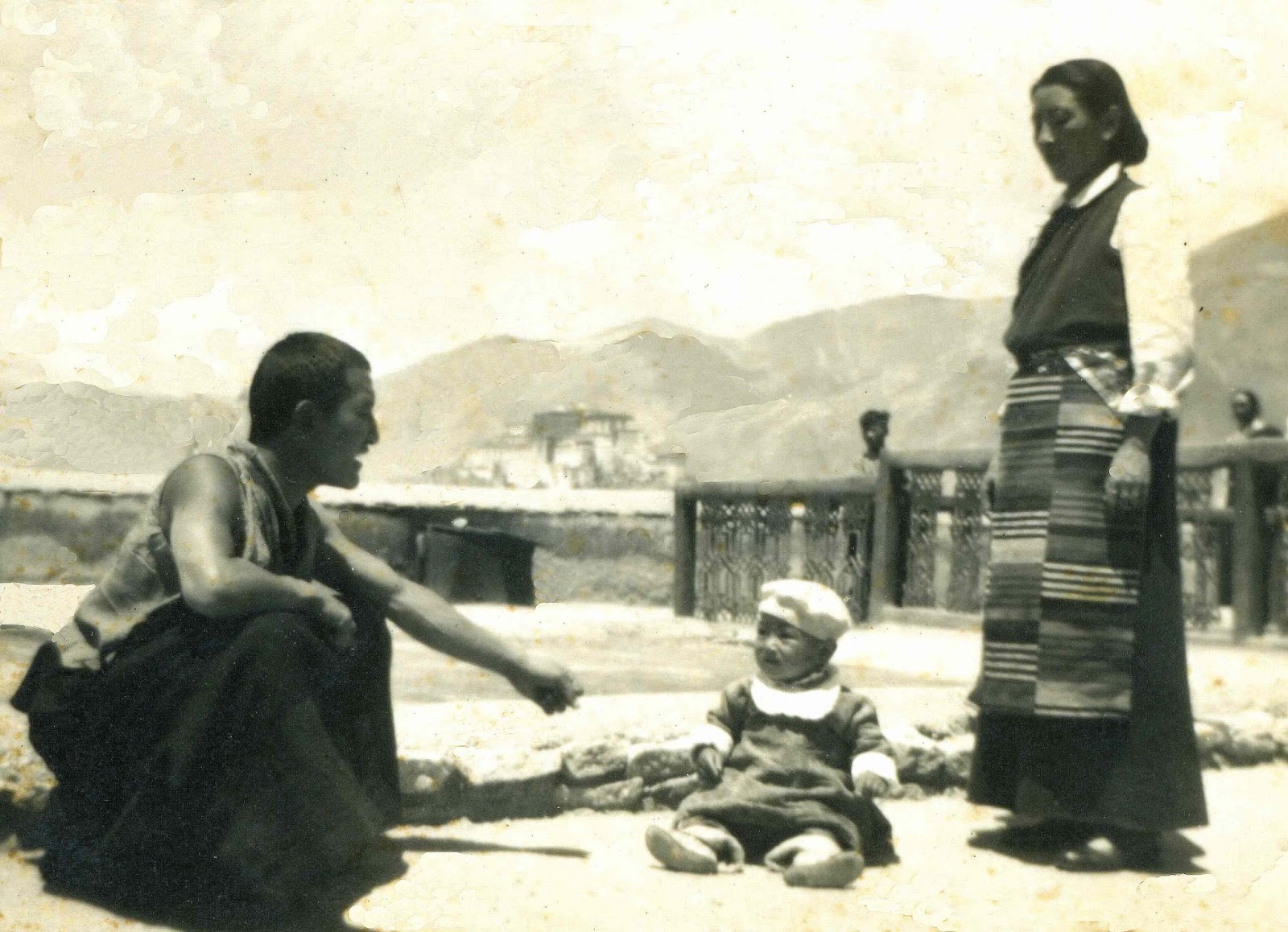 然而,他在第二年还戒于他的根本上师莫确仁波切(Mogchok Rimpoche)。当时,他的哥哥索朗东觉被任命为设于噶伦堡的图伯特贸易代表处助理,已经离开拉萨去了印度。1950年9月,在共产党进攻昌都前大约一个月,他的姐姐拉旺·洛桑德吉(Lobsang Deki Lhawang,我的母亲)带着然扎仁波切和我一道,离开拉萨前往印度。我(嘉央诺布)当时年仅一岁半,唯有一张泛黄的照片确切地证实当时我也在场。这张照片拍摄于拉萨老城旁边的八朗学(Banakshol)屋顶上,照片上有我的母亲和然扎仁波切,以及还是个婴儿的我。