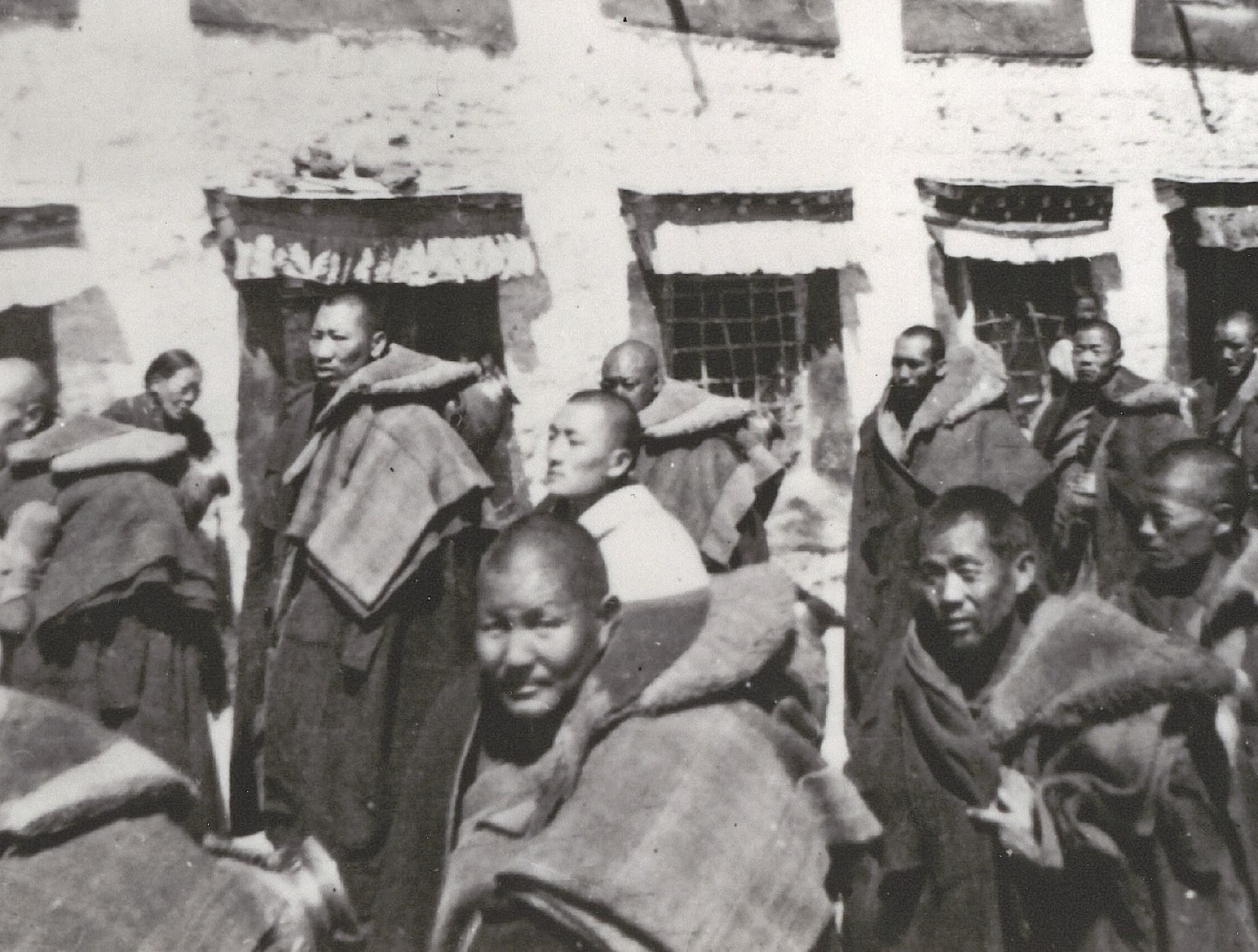 然扎仁波切(居中者)作为铁棒喇嘛,带领居麦寺的喇嘛们行进在拉萨的默朗钦莫法会(传召大法会)上。摄于1950年2月到3月间。