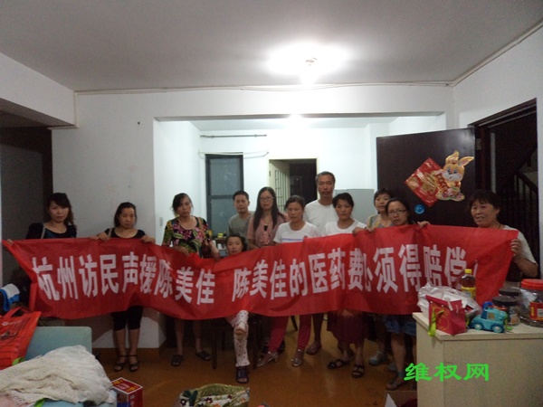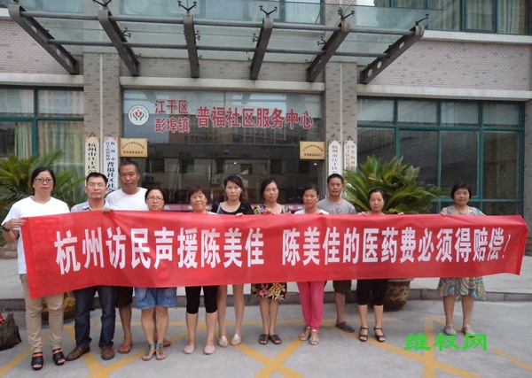 梁丽婉、朱瑛娣、邹巍、王丽民、沈利华、朱彩花、冯国娟、叶红云、徐伟芬、张贤娟、芬亚、凌小妹、沈月珍等人接到电话后,立即赶往普福社区。但等他们赶到时,陈美佳已被拉走,他们又赶到陈美佳家里,慰问陈美佳。访民们对普福社区党委书记杨月根的暴行十分气愤,表示坚决支持陈美佳讨回医药费。