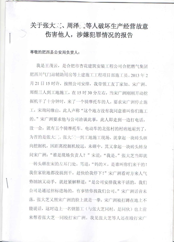 位于肥西县北张村的川气门站是中石化川气东输进入合肥市的重要设施,是合肥市重点工程。施工方中标后进场施工,2013年2月21日15时许,按照公司安排,施工员王茂云与丁家知、宋广洲、郑煜三人到工地施工,在15时30分左右,当宋广洲刚刚开动挖掘机干了十分钟时,来了一个骑摩托车的人,要求宋广洲停止施工,宋询问缘由,此人声称“征收土地补偿款未到位。”宋广洲要求他与公司洽谈此事,此人即走到一边打电话,没一会,就有五个骑摩托车、电动车的北张村的中年壮汉到了,为首的是张大枝。张大枝一到工地施工现场,就拿起一块砖头砸向挖掘机,因距离挖掘机较远,未砸中,其又拿起一块砖头转身问宋广洲:“谁是现场负责人?”宋说:“我是。”张大枝当即就一转头砸在宋的左耳门处,骂道:“妈的×,是谁叫你们来干的!我住家地都没搞到干,赶快给我停下!滚蛋!”宋广洲看对方来人气势汹汹又动手,就赶紧解释道:“是公司安排我来干活的,我们公司是通过招标进场的,有事情你找我们公司。”宋广洲话音未落,张大枝又照宋广洲的脸上就是一拳,宋广洲被打蹲在地上不能说话,这时边上一名钢筋工(与张大枝同村,可能是同伙)也上前来帮着张大枝一同殴打宋广洲。王茂云见张大枝等人还在殴打宋广洲,就上前拦住张大枝并打110报警。张大枝见王茂云报警了,气焰反倒更加嚣张,扬言:“我讲不给你们干就不给你们干,什么人来也不行!共产党管不了,我是国民党,是黑社会!警察来了打你又怎样!”施工人员面对暴力为自保只得拿起钢筋自卫。正打着,派出所警车到了,下来三位穿制服警察,警察一边制止对方不让再打,一边出于保护目的把王茂云拉进警车,同时责令张大枝到派出所处理此事。可目无法纪、嚣张至极的张大枝一伙,根本不把派出所警察放在眼里,这时,工地现场驶进四辆轿车,从这四辆轿车里下来大约十几人,为首的是张大枝的舅爷周泽义,其余人是周泽义纠集的当地人。张大枝见来了帮手,气焰更加嚣张起来,他带人强行把王茂云从警车里拖出来再次殴打,有一名警察上前阻止也被他们用钢筋打伤腰部。张大枝、周泽义与二十人左右殴打王茂云和宋广洲二人,这时工友丁家知、郑煜上前拦住张大枝一伙不让他们打,于是张大枝等人一起上来四人,拿出事先准备好的钢筋对四人乱打一气,四人被打得无处可逃,乘隙逃到建设单位的活动房内,关上房门以为借此躲过一劫。孰料,张大枝、周泽义带着这十几人硬是用钢筋将简易房墙壁破拆掉,把王茂云、宋广洲堵在里面殴打。这时,派出所增援警察来了,三辆警车中下来的一些警察命令张大枝、周泽义等人停止行凶。哪知,张大枝、周泽义等人反而打得更凶了,他们中的一人用手中的钢筋朝王王茂云头上猛地砸下来,王茂云用左手朝上一架,护住头部,钢筋打在手臂上,当时王茂云手臂钻心般疼痛,再也抬不起来,左手臂被打断了,人疼得倒在地上不能动,这时张大枝、周泽义见王茂云受伤倒地不能动,又去追打宋广洲,此时又一批二十人左右警察到场,30分钟后才将现场控制住。施工人员四人皆被打伤,王茂云手臂骨折、宋广洲右手食指被打得皮开肉绽,后缝了十几针。四人皆有软组织受伤。