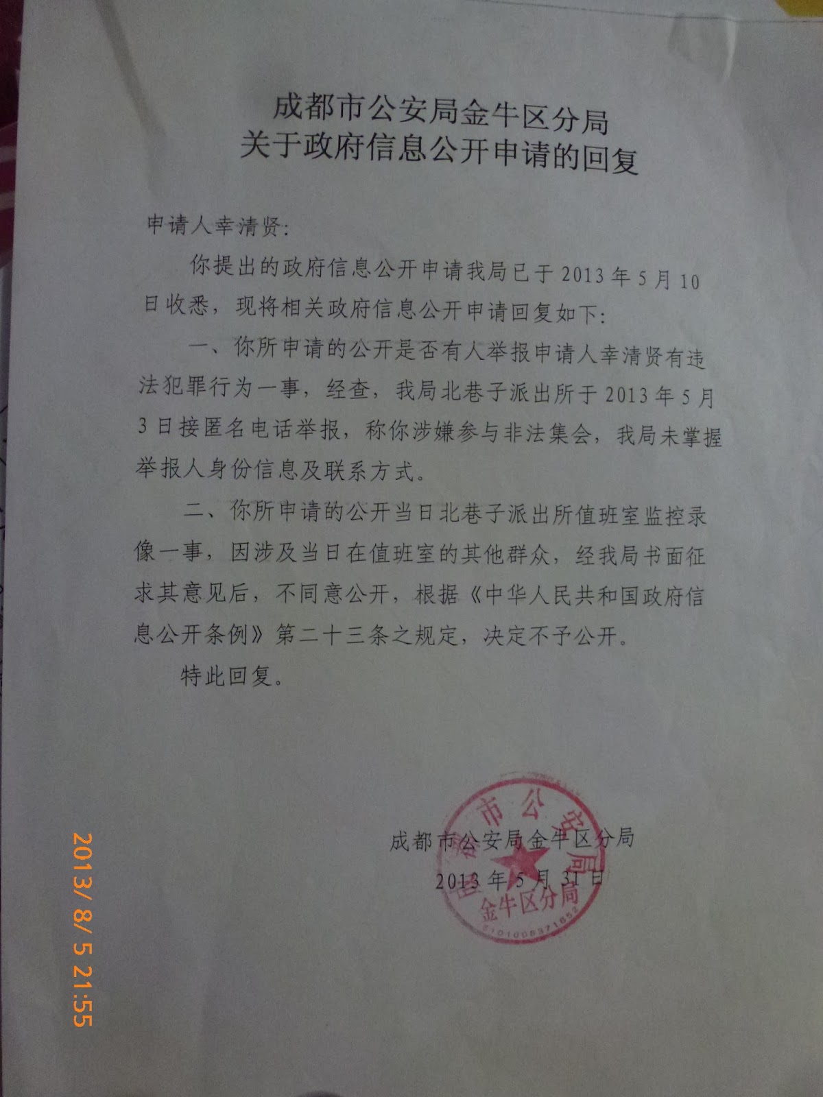 幸清贤不服,以向成都市金牛区法院递交了行政诉状,要求1、依法确认被告超过法定时间于2013年5月31日作出的《关于政府信息公开申请表的回复》行为违法2、依法确认被告于2013年5月31日作出的《关于政府信息公开申请表的回复》内容违法3、责令被告于判决生效后三日内向原告公开2013年5月4日值班室内上午9点至11点值班室内的监控录像视频资料。4、责令被告于判决生效后三日内向原告公开5月4日是否有人向其举报幸清贤有违法犯罪行为的信息。金牛区法院已经收到诉状并在材料清单上破天荒的签字确认。