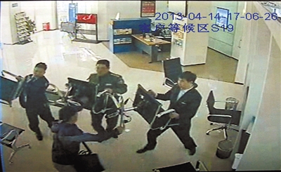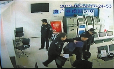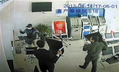 - 嫌疑人(圈中)拿水果刀冲进银行追赶银行职员。