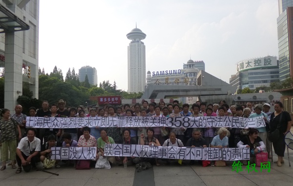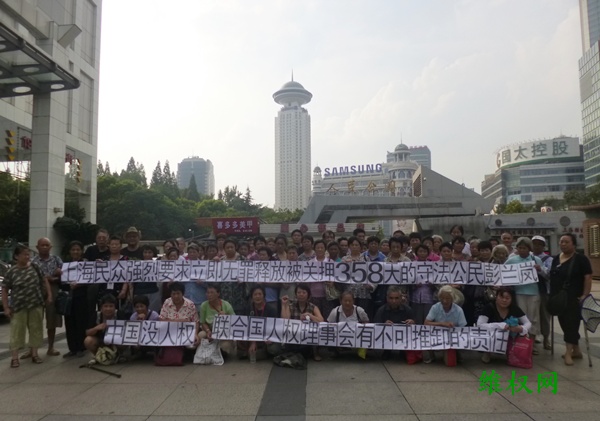 (维权网信息员孙小芸报道)8月5日, 66位上海上访维权人士聚集在人民公园广场,为因征集《上访维权者人权状况调查表》而被北京警方抓捕的湖南维权人士彭兰岚打横幅声援呐喊:“上海民众强烈要求立即无罪释放被关押358天的守法公民彭兰岚”、“中国没人权,联合国人权理事会有不可推卸的责任”。