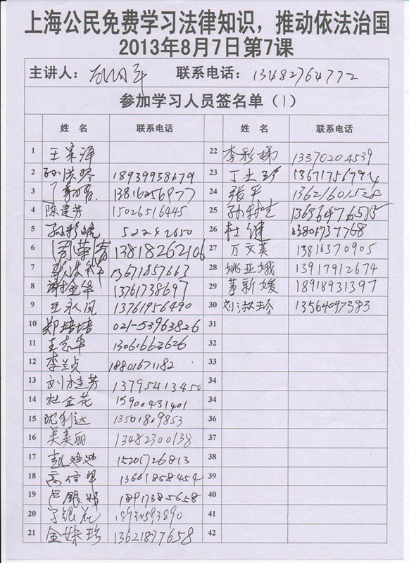 (维权网信息员孙小芸报道)8月7日 中午11时45分~12时45分,上海公民免费学习法律知识,推动依法治国第7课成功完成。