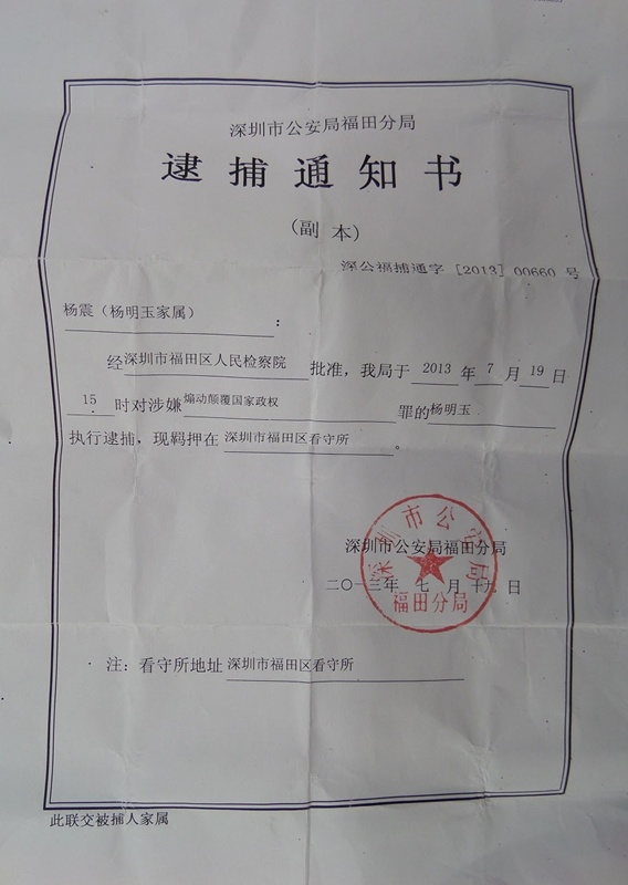 (维权网信息员孙雨报道)本网获悉,6月12日在深圳被警方带走后失踪的杨林,已经被深圳市公安局福田分局以“涉嫌煽动颠覆国家政权罪”执行逮捕,逮捕日期是7月19日,目前杨林被关押在深圳市福田区看守所。