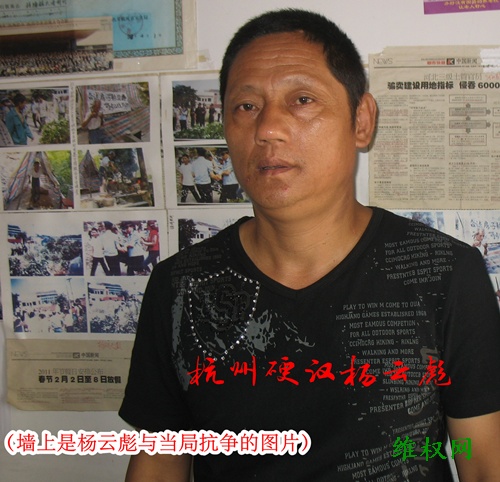 2006年8月,杭州之江度假区“政府”对杨云彪家非法强拆,杨云彪用煤汽瓶和汽油相抗,被杭州市西湖区法院以“妨害公务罪”判刑两年。出狱后,杨云彪继续维权,又被西湖区法院以“破坏生产经营罪”判刑三年。去年5月杨云彪第二次出狱后,向各级检察院和法院提出申诉,但没有人理他。无奈,他只好到北京去上访,仅一年多时间,他已数十次被关黑监狱。