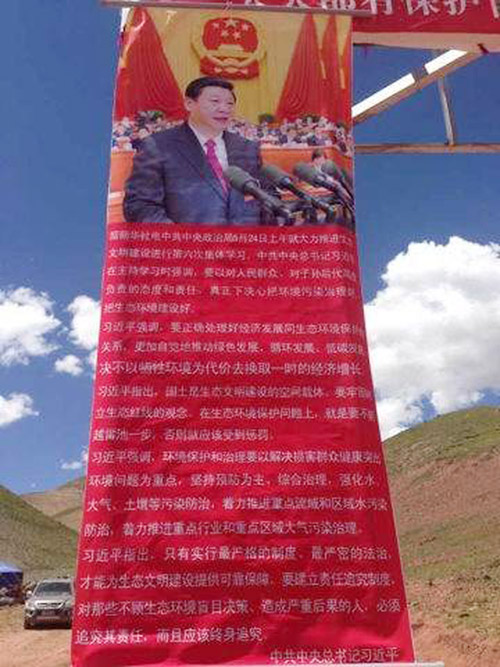 8月16日,执行镇压抗议开矿藏人任务的军警,在阿多乡将挂有习近平关于环境保护的讲话及照片撕碎并扔在地上。