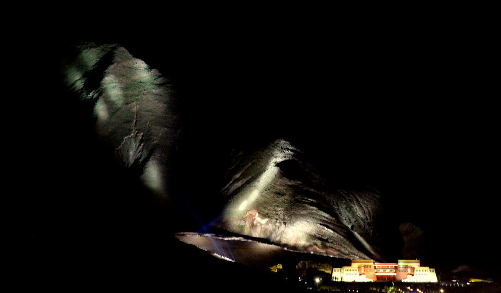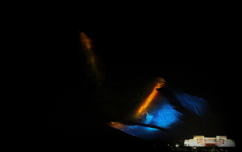 专为此剧而建的剧场位于拉萨东边的朋巴日(宝瓶山)一侧,隔着拉萨河,与饱含沧桑的布达拉宫遥遥相对,完全是仿造布达拉宫的赝品出炉,无论是在自然的阳光下还是人为的灯光下,立即映衬出那类似地摊上摆着卖的假古董的本质,除非是在深夜浓重的黑暗中才得以掩藏。