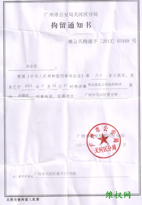 孙德胜被带走后便与外界失去联系,其家人到处打听也未知下落。8月22日,孙德胜的哥哥孙金喜接到弟弟被刑事拘留的通知书,奇怪的是通知书开头显示他是于8月12日23时被广州天河分局以“涉嫌聚众扰乱公共场所秩序罪”刑事拘留,羁押在天河区看守所,而结尾盖章下方的日期是8月13日。