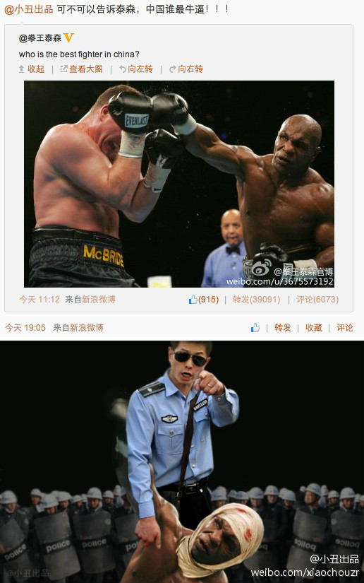 8月19日,前世界重量级拳王迈克·泰森开通新浪微博,他向中国网友抛出的第一个问题是:“谁是中国最能打的人?” 引来众多网友踊跃回复。而当有网友给出答案“城管”后,不少网友希望城管能和泰森“一决高下”。不过,泰森显然没能看出这是一个调侃,“城管是谁?一个狠角色?我从来没听说过,”他写道。泰森的不明就里逗乐了不少网友,他的这个提问得到了更多带有调侃意味的回复,但显然只会让他更摸不着头脑。泰森在不久后的另一条微博中说:“很多人都在讨论这个很能打的城管,可我还是不知道他是谁……”