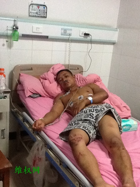 (维权网信息员成云报道)8月28日早晨5点半左右,有8个二三十岁穿着黑衣的蒙面年轻人,每人带一根电警棍,冲进郫县大地石材厂(郫县犀浦镇五粮村5组)里面,二话没说直接用电警棍毒打两个看厂人员骆良勇、仁家云(音),施暴中两工人哀求并问他们为什么打人,凶手们说:“你们老板知道!”在两工人被击昏后(仁家云老人近70岁)凶手们用绳子将两人捆住手脚,眼睛用黑布蒙上并用透明胶缠绕,抬上一架白色无牌照金杯车,拉到几公里外高新区的一拆迁后长满荒草围墙围住的工地内,暴徒们再次实施殴打且不准他们离开。期间有个歹徒还打电话说:“杨哥,人我们已带过来了。”(后来拆迁人员来拆厂房后伤者才明白,他们被打被绑架是为了拆他们的厂房。)在中午11点左右,骆良勇见他们在吃饭,谎称自己要方便,借机逃跑。