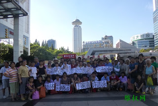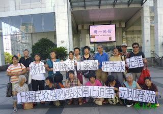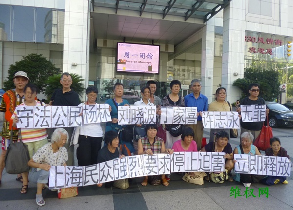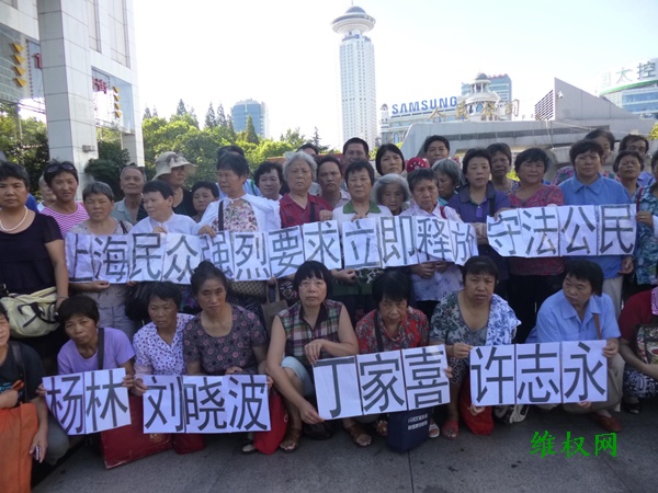 (维权网信息员雷鸣报道)8月19日下午和8月21日上午,上海100多位民众在上海人民公园广场等地为守法公民杨林、刘晓波、丁家喜、李化平(网名“挪威森林”)、许志永等被迫害坐牢的良心犯声援呐喊,强烈抗议当局对人权捍卫者的打压,要求停止迫害、立即释放守法公民。