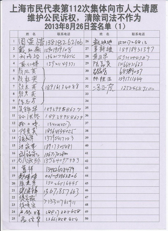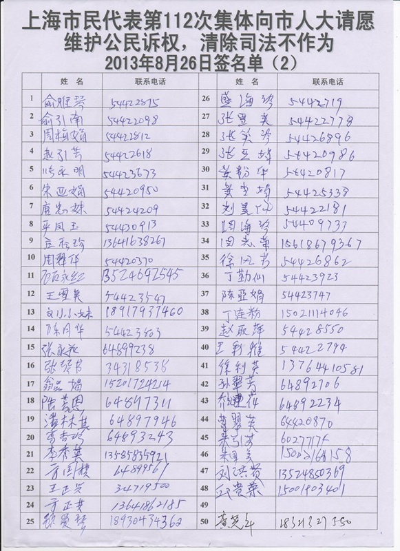 上海市民向市人大常委会已经连续进行了112次请愿——“我要立案,捍卫法律,还我诉权”,人大已向上海最高当局——中共上海市委汇报,上海市委应当与上海市人大共同承担起捍卫法律、维护公民诉权的责任。宪法赋予公民的权利是任何组织或个人不得侵犯和剥夺的,地方法院剥夺公民诉权,为违法犯罪的腐败恶势力保驾护航,已经构成严重渎职。中共上海市委、市人大常委会应该追究渎职的院长、立案庭庭长,整顿法院,保证公民诉讼自由,畅通诉讼通道。