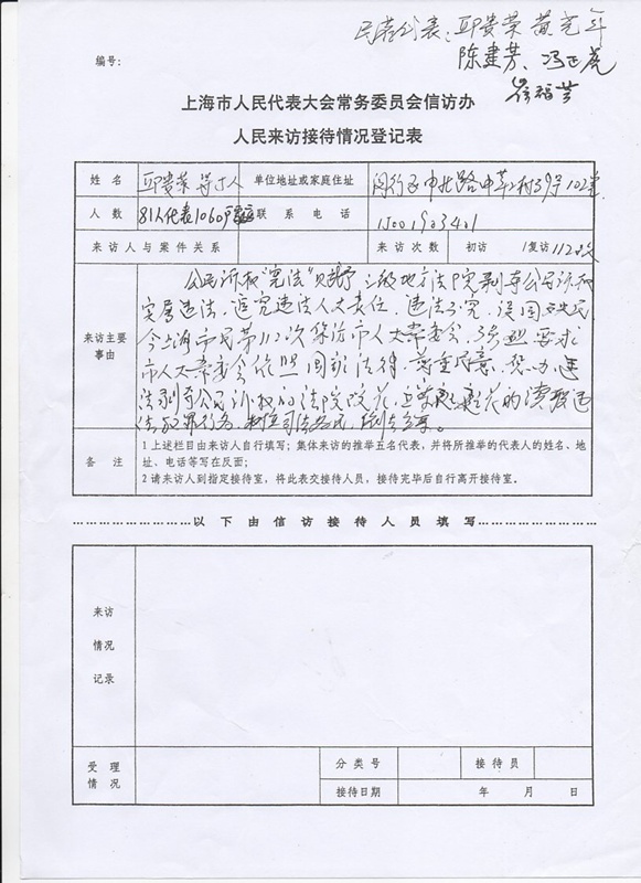 (维权网信息员孙小芸报道)8月26日星期一下午2时左右,上海81名维权民众来到上海市人大常委会人民来访接待大厅,等候人大接待员接待。每次接待,代表们都请求人大常委会及人大代表履行法定职责,尊重法律,维护公民诉权,清除司法不作为,彻底铲除司法腐败根源。