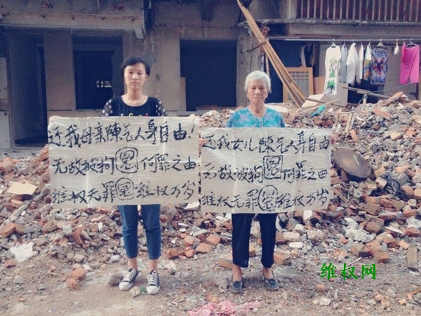 (维权网信息员林仙报道)日前,已古稀之年的福州女冤民陈气妈妈和一对未成年的儿女,在强拆成残垣断壁废墟的家园前举牌抗议,全家老少齐声讨鼓楼公安分局公然制造冤案!