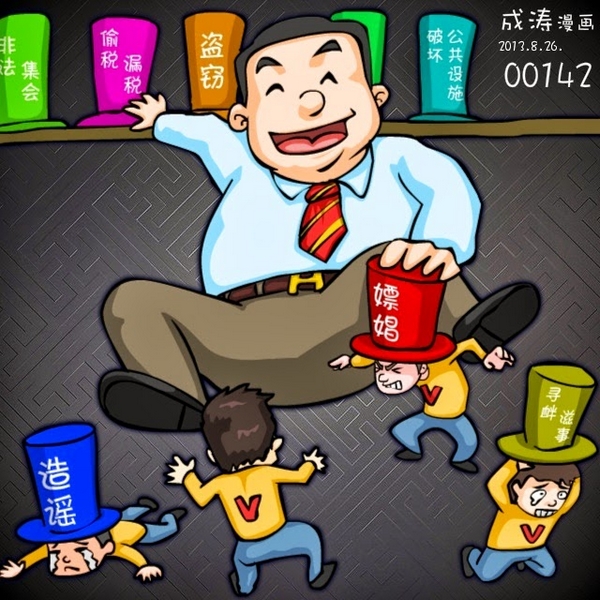 继上周北京警方公布“微博大V薛蛮子因嫖娼被拘”的消息后,本周警方再度披露“薛蛮子涉嫌聚众淫乱”,将薛涉嫌嫖娼这起“治安问题”认定为性质更严重的“刑事案件”,并且官方媒体对此事开动了“宣传火力”,多家媒体不仅详细播报了警方如何抓捕薛以及薛承认自己“犯罪事实”的视频,新华网一篇报道更指出薛有“特殊性癖”、“经常嫖娼”、“拖欠嫖资”,而人民网一篇评论甚至借专家之口认定薛有“性瘾症”、“性爱频率过高”,而央视新闻联播则在重要新闻时段用3分钟时间播报了薛的嫖娼事件,种种迹象看来,官方对薛案连篇累牍的、大做文章的报道背后,似乎有借此警告微博名人,配合”整治互联网制造传播谣言”活动,钳制言论自由的嫌疑。无独有偶,本周各大媒体报道了各大省市自6、7月起,公安系统“打击违法犯罪,规范互联网秩序”专项行动的所取得的“成果”,有许多网民因“传谣”被捕,其中还出现了宿州砀山车祸谣言、广州狼牙山五壮士谣言、河北青山娄庄命案谣言等多起有争议的事件,官方打击“传谣”的真正动机引起广泛质疑。8月31日,广州公安官方微博发言警告“谣言必须打,打击须合法,严防扩大化。子产不毁乡校,若人人噤若寒蝉,相视以目,显然是噩梦。”但这条消息很快就被删除。此外,近期新浪微博推出信用积分制,信用积分低于60分,将不能再增加粉丝,所发内容不能被转发,低于40分的,即使拥有千万粉丝,用户所发的微博也只能“自娱自乐”,相当于零粉丝,低信用用户需举报赚积分,通过举报其他违规信息等方式“赚”积分,恢复自己的微博权益。在围捕大谣背后,一张大网似乎也悄然收紧。