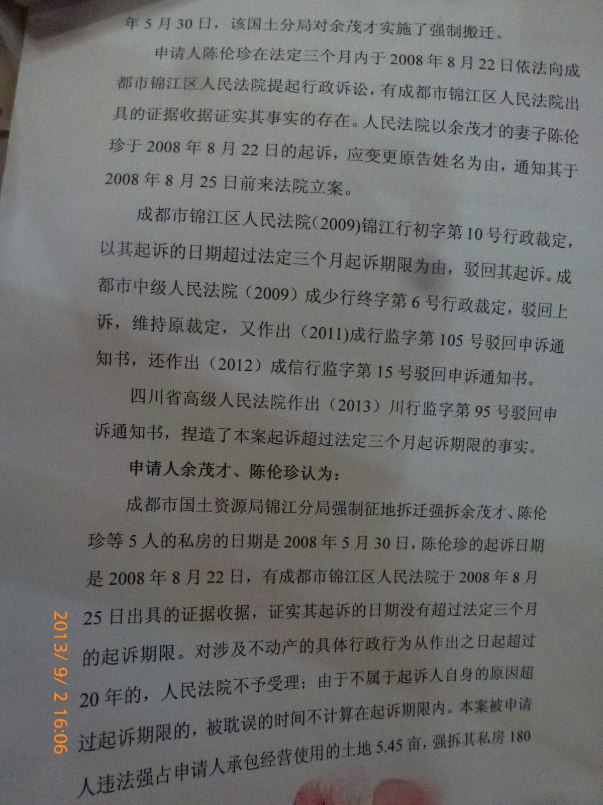 据陈伦珍介绍:她家于2008年5月23日收到成都市国土资源局锦江分局的强拆公告,她于8月22日向锦江区法院提起行政诉讼,但因8月22日恰逢周末,立案庭法官在其证据清单上签字让他25日再来立案,老实巴交的陈伦珍夫妇,依言于8月25日到锦江区法院立案,谁知,就这样,三审法院均无视这一事实,认定陈伦珍夫妇已经超过诉讼时效,从而将其阻挡在法律救济途径之外。