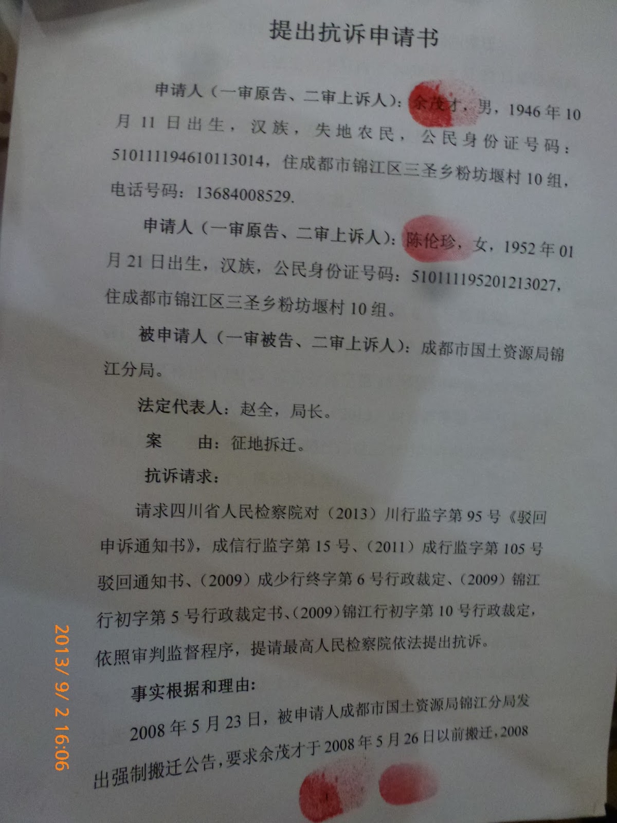 (维权网信息员徐菲报道)2013年9月1日,被非法强拆后申诉无门的四川访民陈伦珍,向四川省检察院提交了自己的抗诉申请,要求对三级法院的枉法判决进行抗诉。