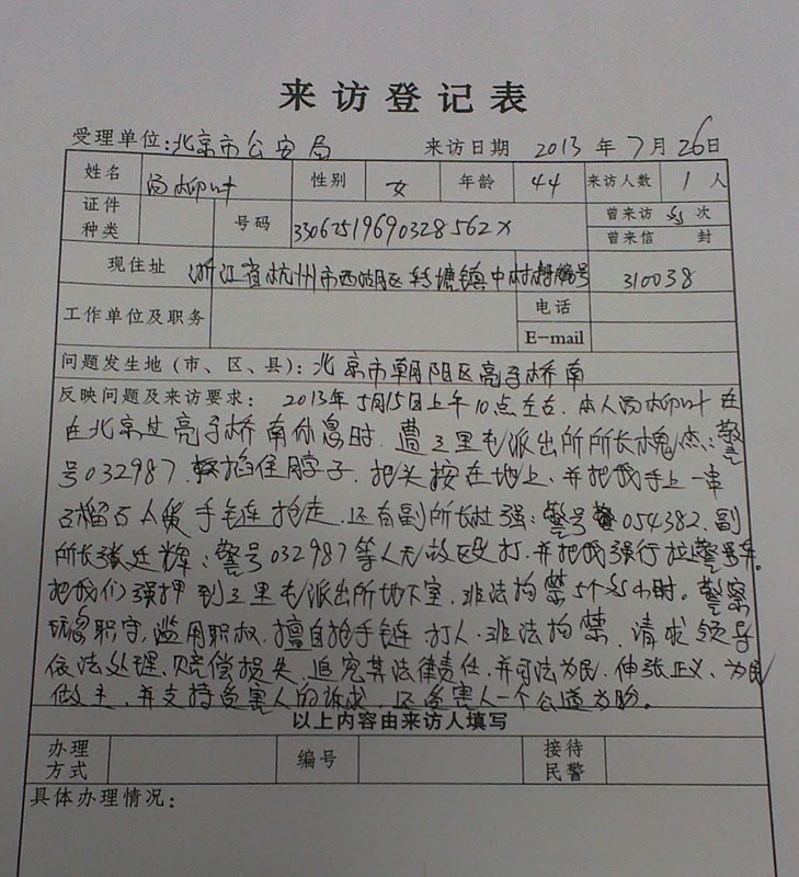 申请人原是杭州延安路工联商厦承包经营户,2009年因拆迁发生纠纷,商厦方既不赔偿又不安置,至今仍未解决。我是小本生意,亏损不起,如今负债累累。因商厦和政府拖着不予解决,我只好到北京上访。2013年8月7日,我刚回家,家里就闯进一些身份不明的人,并把我强行拖向一辆警车。在拖拽的过程中,我的裙子被撕破,手臂上、腰上、腿上、屁股上都被抓伤;我的手机和我丈夫妺妺的电脑也被抢走。8月9日早上,我带我6岁的儿子到医院看病,西湖分局的人又带了那帮人把我从医院绑走带到转塘派出所,并于凌晨2时以“妨害公务罪”将我押送到杭州市看守所刑事拘留,8月16日期满后又将我从看守所押到转塘派出所,17日凌晨3时才将我送回家里。回家后,西湖分局仍以“妨害公务罪”对我实行取保候审,限制我的人身自由。我和我丈夫拒绝签字,他们却让村书记金岩才签了字。
