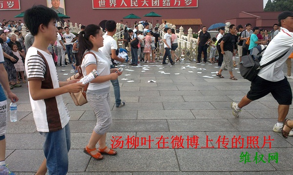 2013年5月15日,汤柳叶在北京上访时,被北京朝阳区三里屯派出所所长槐杰等人用暴力手段拖进派出所非法关押5小时,并受到殴打,手链被抢。7月26日,汤柳叶到北京向北京市公安局控告槐杰等人违法拘禁访民的情况。8月1日,她在天安门广场目睹了浙江冤民撒发传单的情景,回家后在微博上上传了她在天安门拍到的照片。杭州当局获知汤柳叶发微博的信息后,于8月7日抄了她的家,抢走了她的手机和她丈夫妹妹的电脑。